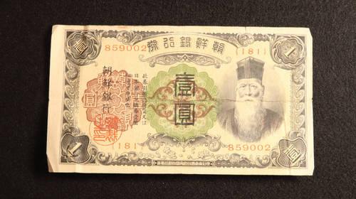 | 詳細: | 韓国銀行券 壱圓、1953年2月17日発行~1962年6月10終了、大きさ:54mm×111mm(米国印刷) 表面:漢字で銀行名と漢字とハングルで額面を表示。 裏面:英語表記で銀行名と額面を表示、そして韓国銀行の行章が描かれいます。 |