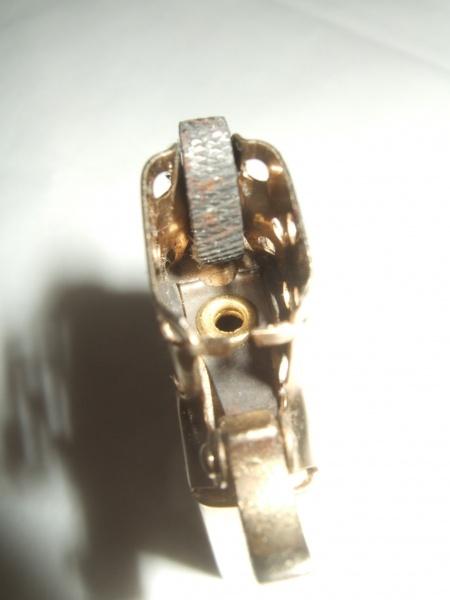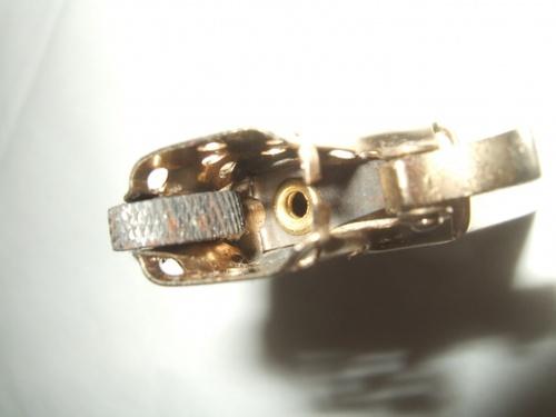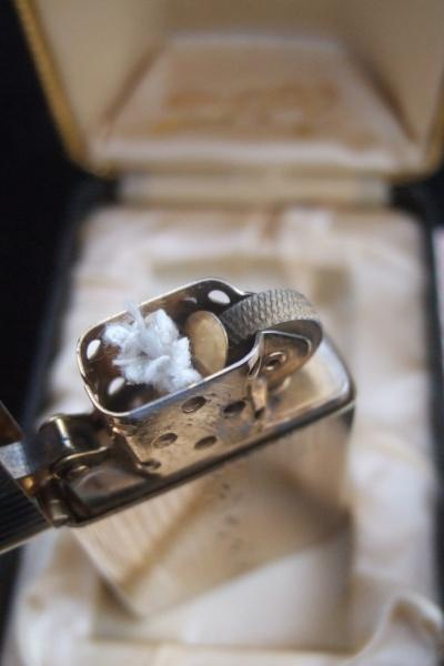 このライターは、1956年製の問題があった「ホイールガード」を無理やり(切断面が雑)カッターか何かで取り去られ、1956年or57年製のケースに装着して販売された物です。(日本企業なら発売中止) 1958年にアイレット位置が変更される迄の約1年数か月は、「ホィールガード」部分が取り去られただけの中途半端な「カムスプリング」のまま出荷されていました。(残存率の少ない希少品です) |
