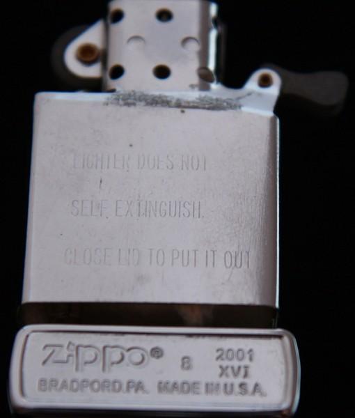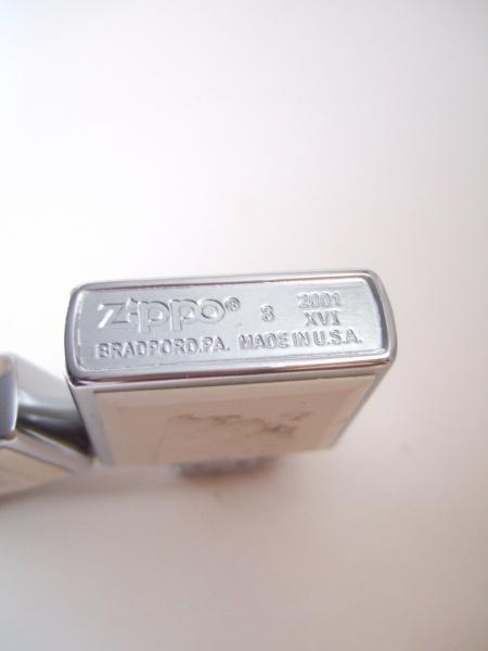 | 備考: | 1)上段左側、、、「Zippo」のロゴ?(記号が上方の位置にある、2001年?当時は下方の位置が正しい(2005年4月以降の製造から上方の位置に変更される) 2)上段中側、、、「 8 」の数字表記では無く、英字の「H」が正しい(Aを1月・Lを12月、この様にA~L迄の英字を順番に使いライターの製造・月を表しています) 3)上段右側、、、「2001 XVI」と表記されていますが、”XVⅠ”なら「2000 XVⅠ」が正しい(上段右側の記号は、ライターの製造・年を表しています) 4)下段左側、、、「BRADPORD」では無く、「BRADFORD」が正しい、PとFを違えていて此処まで来ると”ジッポー・ライター”を馬鹿にしている様な気がして、腹が立って来ます!!(ブラドフォードとはアメリカの地名です、ジッポー・ライターの発祥の地でジッポー愛好者の聖地です) |