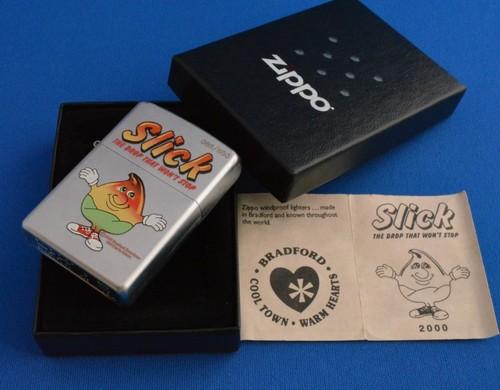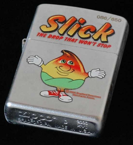 | 詳細: | 2000年のスワップミートで650個限定で販売されたブラッドフォードのダウンタウン商店街のマスコット「SLICK」のジッポーです。 |