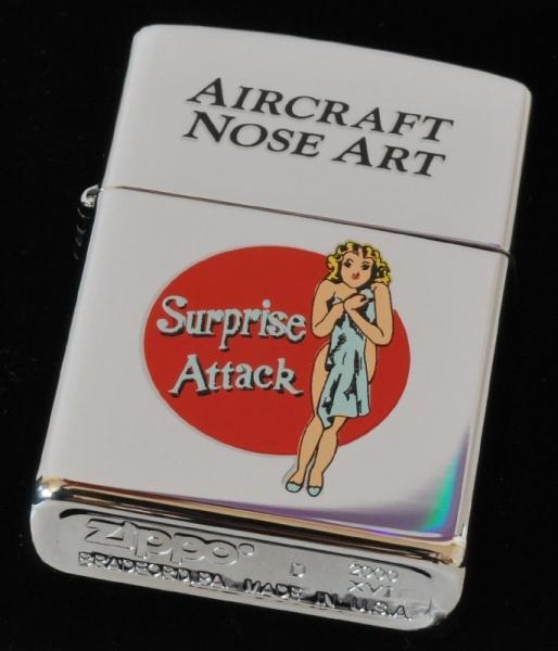 | 詳細: | Surprise Attack ノーズアートとは、戦闘機の前方に美女やマンガのキャラクターをデザインしてそれぞれの個性を出し、戦場へ向かった。 ある者は敵機を追撃するごとにバクダンの絵を1つづつ機体に描き、自分は今までに何機追撃したと英雄気取りでいる者もいた。 彼らはいつ散るかもしれない戦場から、その背景には飛行機に絵 (NOSE ART) を入れることで唯一、心がなごんだのだろう。 |