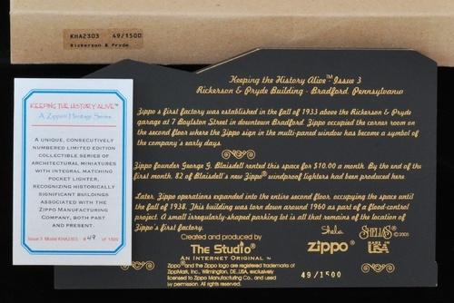 | 詳細: | zippo社とThe Studio社のコラボレーションにより製作された「KEEPING THE HISTORY ALIVE」シリーズ。ジッポーと木製ディスプレイのセットです。1500セットの限定品で、zippo裏面とディスプレイ裏面に共通のシリアルナンバーが刻印されています。 これは、Bradfordダウンタウンにあるタイヤでも有名な「Goodrich」社も入っているビルが「モチーフ」になっています。 |