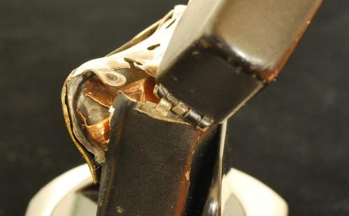 | 備考: | 本品はZippoに拳銃で故意に発射されたものです,当然ながら国内ではこの様なことは違法のため出来ません。本品は、私の師匠のT氏がアメリカのマニアから譲り受けたもので、輸入に際し通関検査を受けた合法品です。実弾が食い込んだ様はリアルで迫力があり「オブジェ」としても、魅力のあるアイテムです。 画像の「スタンド・ホルダー」を、お付けします。 |