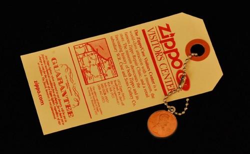 | 備考: | ラッキーペニーとは、ジッポー社製のライターや他の製品に対する「無料修理」を宣伝する為に配られたキーチェーン。「1セントも取らない」と云う意味を込めて、1セント硬貨が収められています。(硬貨は2003年) |