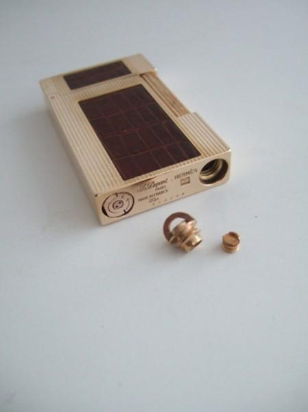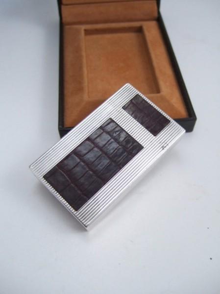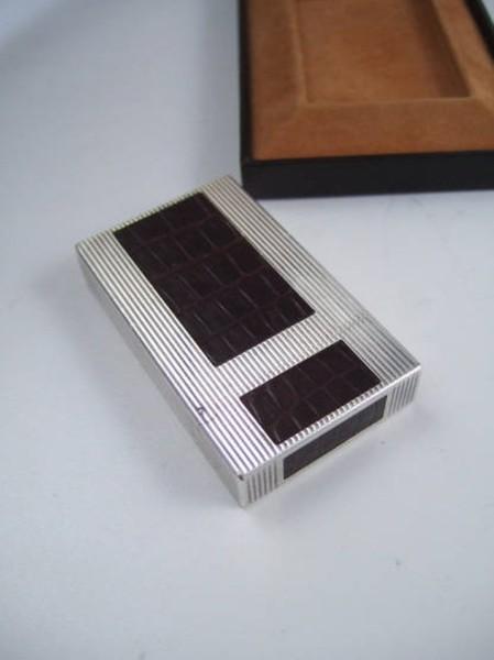 | 詳細: | ライン2をベースに、ダークバイオレット(濃い紫)の本クロコで「 HERMES」の “ H ” をイメージしたデザインです。 エルメスとエス・テー・デュポンとのコラボで販売されたモデルです。 参考画像は、同デザインで「20ミクロン」の厚い金メッキを施した商品です。(商品コード:4794で当ショップで販売中です) |