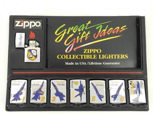 | 詳細: | ブルーエンジェルス (Blue Angels) は、アメリカ海軍所属のアクロバット飛行隊です。 汎用のディスプレイ・ボードにセットされた「ブルーエンジェルスの紋章」柄を含めた、8個セットです。 リッドをオープンにして、ディスプレイされている、左上の「ブルーエンジェルスの紋章」柄のジッポー1998年製・ブラッシュクローム仕上げ。 その他「航空機」柄のジッポーは「両面デザイン」で、1993年製・ハイポリッシュ仕上げです。 |