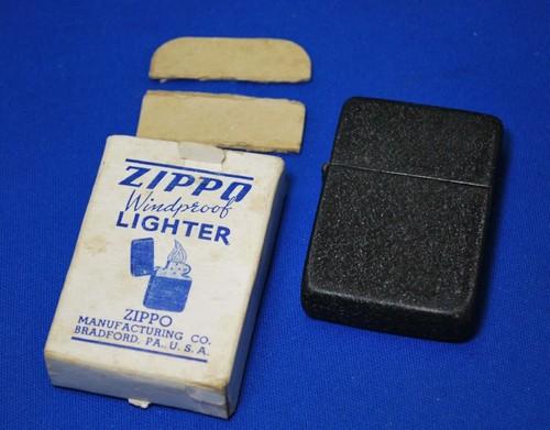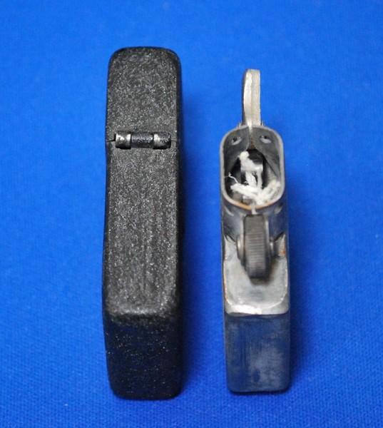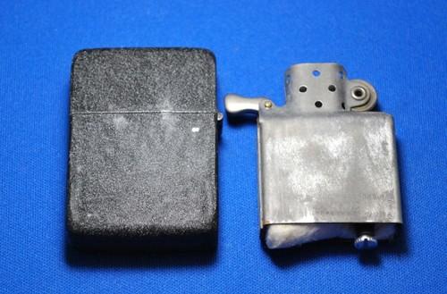 | 備考: | 1943年後期~1945年製、ケース・インサート共にスチール製、3バレル・ヒンジ、ダルマカム、波状リーフスプリング、ラウンド型カムレスト、14穴チムニー(片面7穴)、水平歯フリントホィール、シガレット型オイル止め(1本タイプ)、アルミ製フリント・スリュー、ジッポーは未使用品ですが、裏面とヒンジにクラッケル塗装の小さな剥がれが見られます。 |