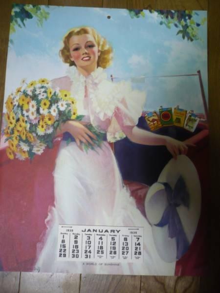 | 詳細: | 1939年、ピンナップ・カレンダー(月捲り)です。 花束を片手に持つ美女と当時のタバコ「CAMEL・LUCKY STRIKE)等が描かれています。(サイズは約:27×35.5cm) |