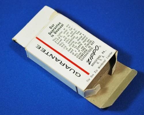 | 詳細: | 1962年、ギフトBOXのデザインが変更されたのと同時に「ミニチュア・ボックス」もストライブから炎柄に変更された。このBOXは1970年代終わり頃まで使用されていたが、それ以降ミニチュア・ボックスは作られていない様だ。この時代の返送用パケットはアメリカへ直接買い付けに行っているアンティーク・ショップ等で店頭に並ぶことがあり、2万円台位で売られている。(本文はジッポーを読む!から引用させて頂きました) |