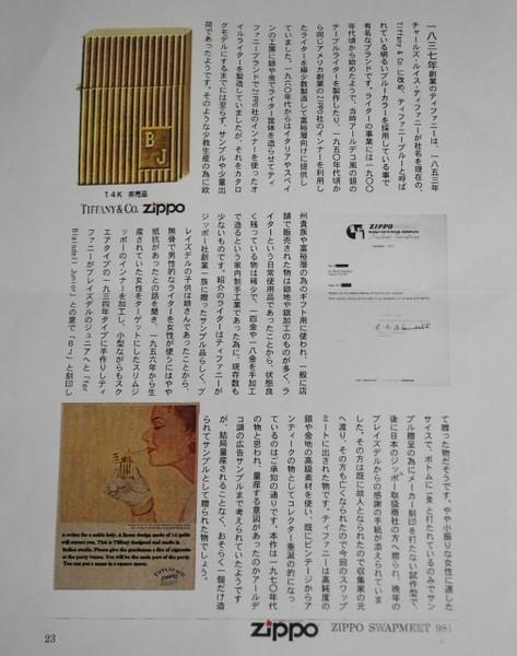 3バレル・ヒンジ、鏡面仕上げ、見事なストライプ仕上げです。(サイズは約:45×30×10mm、金無垢ケースのみの重さで25gと重量感があり、インナーを含めると42g程です) 参考画像-1の「ジッポーライター関係書籍」に書かれている様に、小型ながらも「スクエアタイプ」1934年タイプに手作りし、ティファニーがジッポー社創業一族に贈ったサンプル品らしく、ブレイズデル(ジッポー社創業者)のジュニアへと「for Blaisdell Junir」との意味でB Jと刻印しました。 やや小振りな女性に適したサイズで、ボトムに14Kと打たれているのみで、サンプル贈呈の為に「メーカー刻印」TIFFANY & CO.を打たない試作型で、後に日本のジッポー取扱商社の方へ贈られ、晩年のブレイズデルからの感謝の手紙が添えられていました。その方は既に故人となられたので、今回のスワップミートに出された物です。(ZIPPO SWAP MEET in Japan:1998年第1回東京スワップミート~2005年第5回横浜スワップミートを最後に、計5回開催) 本品は1970年代の物と思われ、量産する意図があったのか「アールデコ調」の広告サンプルまで考えられていた様ですが、結局「量産」される事なく、おそらく1個だけ造られてサンプルとして贈られた物と思われます。(コメントは参考画像-1より転載させて頂きました) |