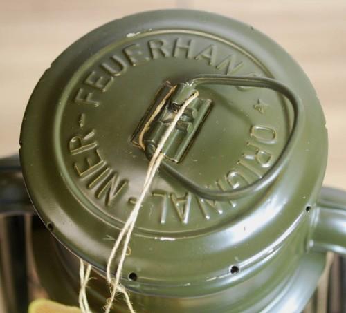 | 備考: | 材質:<本体>鋼(亜鉛メッキ)、本体寸法:13.3×25.5cm、重量:530g、タンク容量:340ml、燃料:灯油、またはパラフィンオイル(推奨)、燃焼時間:20時間以上、明るさ:88ルクス。 ■FEUER HAND(フュアハンド)はドイツ東部のBeierfeldにて創業者であHermann Nier氏が1902年に設立した灯油ランタンのメーカーです。 ■フュアハンドランタンの燃焼の仕組みは、燃料が浸み込んだウイック(芯)に炎が灯り、温められた空気が上昇して煙突から放出されます。この上昇気流によって新鮮な空気が両側のパイプを通って下部のバーナーに送り込まれ燃焼を促進させる仕組みです。 ※赤グローブは「FEUER HAND」の印字が殆ど消えています。(ご理解の上、ご購入願います) ※画像に撮影時のライトの映り込みが見えますが、キズ等ではありません。 |