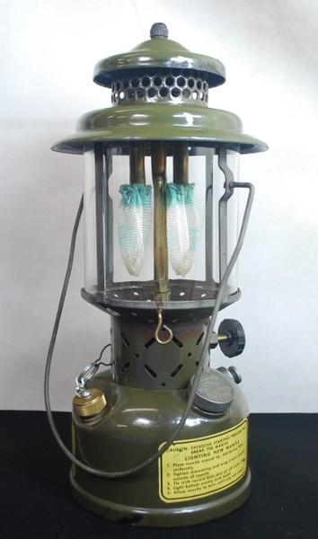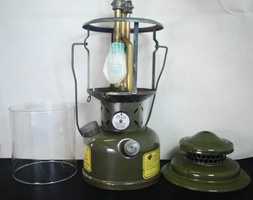 | 備考: | 本品は、上記の252Aワンマントル・ランタンをツーマントル・ランタンに改造しています。また、グローブ及び燃料キャップも他のパーツに交換されています。1956年製(燃料はホワイトガソリン)、燃料タンクには「スペアの工具やパーツ、マントル」を収納出来るようになっています。(本品は空です) 本品は実用ではなくディスプレイして楽しんでいましたので、着火テスト等はしていません。以前の所有者曰く(改造後は照度及びバーナー部への燃料供給が安定向上されています)のコメントを確認しています。 |