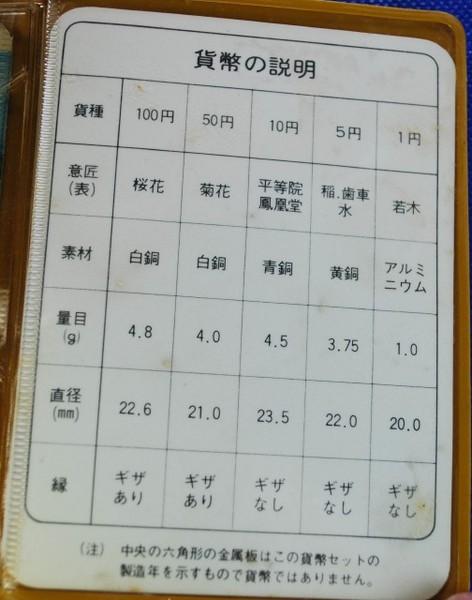 | 詳細: | 1円~100円貨幣(通貨)の5枚セットです。(中央の六角形の金属板は、この貨幣セットの製造年を示すもので貨幣ではありません) MINT BUREAU MINISTRY FINANCE JAPAN |