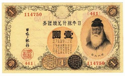 | 詳細: | 兌換紙幣(昭和18年12月15日)発行開始、中央に武内宿禰(たけのうちのすくね)記番赤No.25,70mm×122mm |