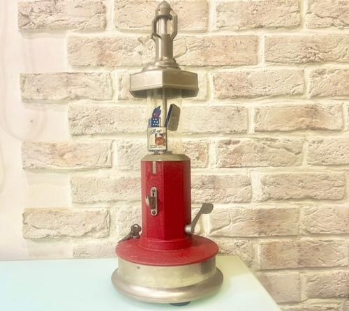 "1¢コイン" を入れると、1回分のオイルが店頭で注入できるサービスは、当時の人々に大変親しまれていたようです。 参考画像の看板は、当時のディスペンサーをイメージして作られ「ciraca1940」ラテン語で「およそ1940年頃」と書かれています。 この「ディスペンサー」は、当初の ”1¢” から ”5¢” に値上げをした、興味深い「逸品」です。 |