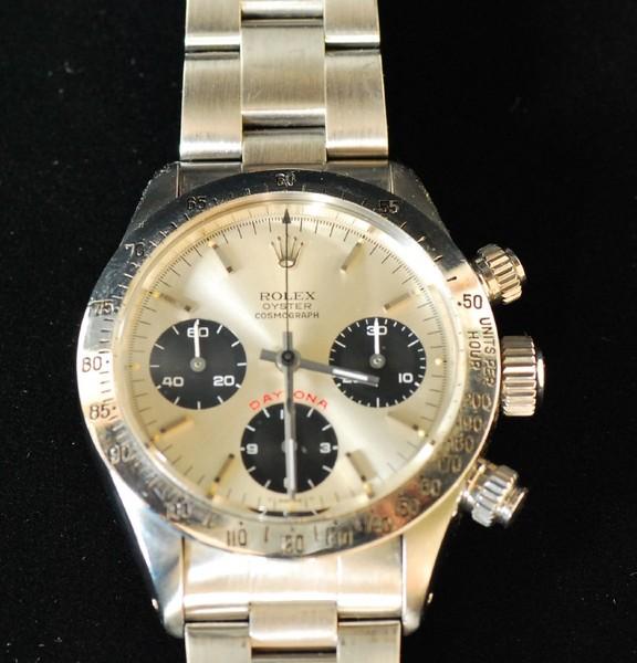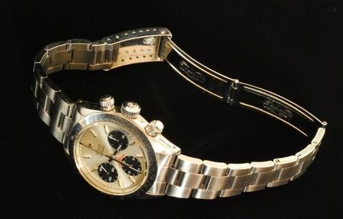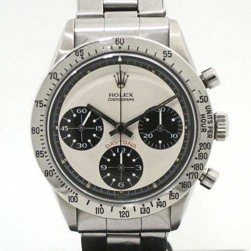 | 備考: | このデイトナは、銀文字盤に黒目玉のRef.6265ステンレスベゼル、ムーブメントは精度と耐久性に優れ、傑作と名高い「バルジューCal.727」を搭載。(テンプを小型化することにより、振動幅を毎時1万8000振動から毎時2万1600振動へとハイスピード化し、精度も向上)、時計本体の販売です。(箱等の付属品はありません) 人気の最終手巻きムーブメント、オリジナル・ビッグデイトナ表記シルバー文字盤、S.Sケース、S.Sオイスター・ブレスレットです。(風防:強化プラスチック・ケース径:37㎜・ケース厚:12㎜・重量:約130g防水:50m・パワーリザーブ:約50時間) 参考画像-1は、通称エキゾチック・ダイヤルモデル(別名:ポール・ニューマンモデル)です。俳優でありレーサーのポール・ニューマン(1925年1月26日-2008年9月26日没:享年83歳)が、映画の撮影中で使用及びデイトナ・スピードウエイで愛用していたと云われています。(1994年のデイトナ24時間レースで「フォード・マスタング」を駆って記録した総合2位「IMSA-GTSクラス優勝」が、彼のレースにおける生前最後で最高位です) 参考画像-2は、オリジナルの「ビッグデイトナ」表記・ダイヤルで、参考画像-3は、交換用の「スモールデイトナ」表記・ダイヤルです。(また、Ref.6265/Ref.6263のオリジナル・ダイヤルには、DAYTONAのモデル名の表記の無いダイヤルも存在します) |